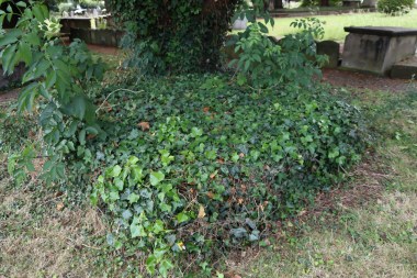 Under trees and in shaded areas invasive ivy does real damage, fastening itself to the stone, hiding inscriptions and, when removed, removes the friable surfaces of the stone. Ivy is very difficult to eradicate from an area once it establishes a network of roots, from which it sends out runners that in turn root themselves. It is resistant to just about every form of weed killer, even if that were desirable in a graveyard that strives to encourage a natural environment. One or two of the gravestones are carved with images of ivy spreading across their surfaces, which seems like an ironic acknowledgement of the inevitable blending of nature with death. The only way of dealing with it is to keep cutting it back when it it begins to climb the grave stones – a thankless and endless task!