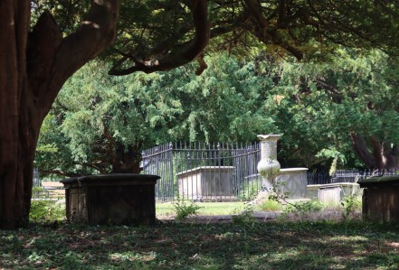 Some of the stonework of chest and table tombs has been damaged, with panels falling away and ledgers tipping to the side, but this is the usual wear and tear as trees grow and roots find new paths, and storms impose injuries.