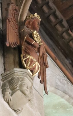 Don’t forget to look up. The ceiling is a particularly fine camberbeam structure, crossed with rafters, with painted panels and bosses. At the ends of the rafters are carved wooden angels.