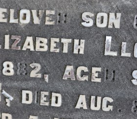 Lead lettering from 1882, some of which have parted company from the headstone leaving empty peg marks