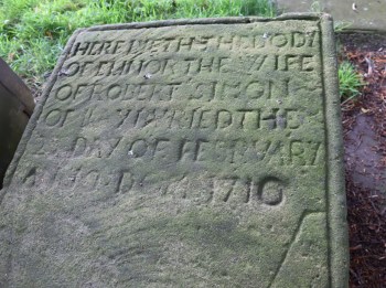 The earliest graves that I have found are early 18th century, one of the earliest dating to 1710, although there may be earlier examples that I have not noticed, including some completely concealed by ivy. A number of examples from this period are ledgers, flat tablets that in this churchyard are usually carved from fine-grained yellow stone, often greyed with age, set horizontally into the ground, with large, simple text, and almost no decorative features. Later ledger stones were sometimes provided with small decorative embellishments.