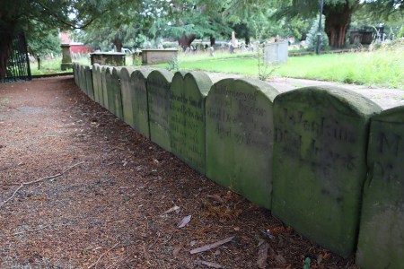 Organized in a row alongside one of the paths, near the east end of the church, are the smallest (c.16in/ 41cm tall) upright grave markers. These are either footstones that have been separated from their corresponding headstones (only ever inscribed with initials and date if inscribed at all), or were purchased as gravestones by those with few means at their disposal. None have many inscribed details, and the one shown left, dating to 1778, is particularly minimalist, providing only the initials of the deceased, the year of death and the age at time of death. Others in the row are slightly more informative than this example but there is insufficient space for them to provide detailed information.