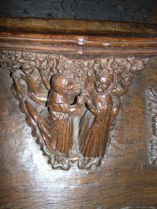 Obviously religious themes and personalities are often in a minority on misericords, but where a monastery or church is named for a particular saint, a misericord may be dedicated to that saint. The Anglo-Saxon saint Werburgh was an 8th century nun and abbess from the Midlands. One of the misericords focuses on St Werburgh’s miracle. There are various versions of the story but all agree that geese were damaging the convent fields. Werburgh ordered them to be gathered up before commanding them to leave. The convent steward, Hugh, was angry with the geese for devastating his field of corn. One version says that whilst Werburgh was away Hugh captured and cooked one of the geese, and when she returned the remaining geese had refused to leave, forming a delegation to inform her of the event and ask for her help. Werbugh ordered that the bones and feathers of the carcass should be gathered up, and the missing goose was reborn. The supporter to the left shows Hugh and Werburgh rounding up the geese. In the centre Werburgh resurrects the goose, which flies away with its companions. On the right supporter Hugh is on his knees, repentant, and is forgiven by Werburgh.