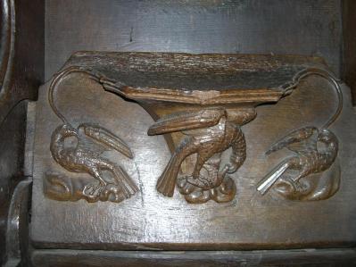 At the far left of the choir stall is the pelican in her piety plucking her breast (shown above), already described in connection with Chester in part 1, but flanked here with foliage.