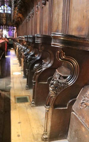 Misericords, just one component of the choir stalls, are usually accompanied by carved arm rests and often magnificent bench-ends, and in the wealthier establishments sit beneath elaborate canopies, as at Chester Cathedral, making up a fascinating ensemble of images, ideas and aesthetics. Arm rests sit between each of the choir stalls, often running partially up the side of the stall too, creating the sense that each choir stall was an individual unit, and are often carved, usually into human, animal and imaginary figures. Bench ends are panels at the ends of each row of choir stalls, and desks, in front of choir stalls, for holding books and music were also decorated. Panels were carved with scenes and they were topped with little carved sculptural elements called finials. Other sculptural features complemented and supported them.