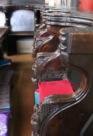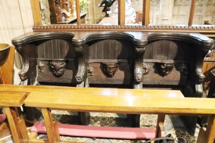 The remaining row of choir stalls at St Oswald’s with the misericords hidden beneath the seats.