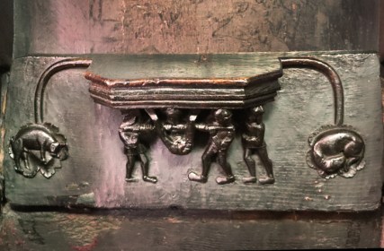 Interestingly, the misericords do not tend to focus on the image of death itself and only rarely give death a voice, unless it is to remind the onlooker of Christ’s sacrifice for humanity. Demons, hell and people being delivered to the hellmouth are certainly represented, but these are more a threat to the living, teetering on the edge of the abyss, than a characterization of death itself. Depictions of skeletons, the personifications of death, fairly unusual, even in the 15th century when the Danse Macabre (and John Lydgate’s derivative Dance of Death) and cadaver monuments, and in particular transi tombs, became popular.