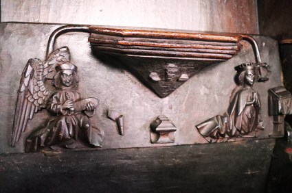 It is sod’s law that the last of the misericords shown above is the one most discussed in books and is the one that I took three attempts to photograph and still came out dismally. This is the only one that represents a specific scene: the New Testament story of the Annunciation. In the middle is a lily growing in a vessel with two blooms and, at its centre, Christ on the cross. This arrangement is flanked on one side by the Angel Gabriel and on the other by the Virgin Mary, each of whom hold pieces of a scroll that records the Angel’s greeting and Mary’s reply. The supporters may either represent doves of peace or the Holy Spirit.