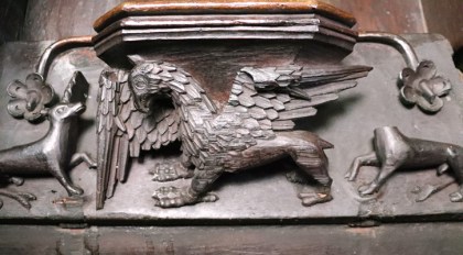 Having acquainted himself with the unknown world, and finding nothing left for him to conquer, Alexander returned to the known world. Alexander’s flight to the unknown may be more favourite story than morality tale, although it can also be taken to represent the folly of all-encompassing ambition. Alexander goes on to conquer Babylon and build himself a massive golden throne. In Babylon, he dies. As David Williams says “Alexander is both the force that battles the monsters as he attempts to extend civilization to the ends of the earth, and he is the monster itself, demolisher of cities, reviser of history.” The misericord’s supporters also show griffins. Griffins are discussed further with reference to a splendid example at Gresford in Part 2.