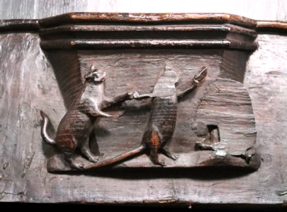 A badly damaged misericord shows two cats, both standing on their hind legs in front of something that is now missing but appears to show a mouse hole at the base, with a tiny mouse with pointed ears to its right. The cats are holding hands, with one apparently leading the other. The leading cat seems to have been holding something in its outstretched paw. Perhaps the upright stance reflects the cat’s commanding, self-possessed and often self-satisfied view of its position within its own universe. An alternative interpretation is that when animals are shown adopting human behaviour, it is a reminder of human failings. Similarly standing on their hind legs are the cats in MS. Bodley 764 (folio 50r), which also shows cats on the hunt.