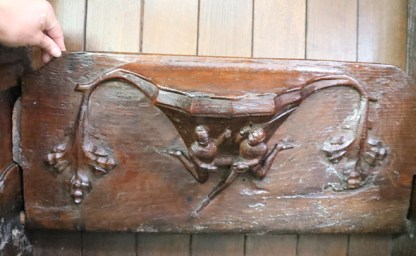 As I was just about ready to hit the Publish button on this post I had a whizz through Dominic Strange’s Timeline and Gazetteer, which revealed that St Andrew’s in Bebington on the Wirral possesses misericords in three choir stalls, plus two that have survived being separated from their choir stalls, now serving as corbels. Although the church is not open except for Sunday services, weddings etc., Karen from the church office very kindly arranged for me to visit when volunteers were working there.