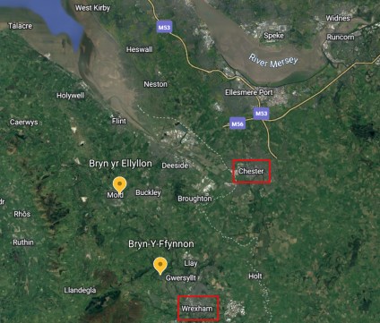 Bryn y Ffynon (Brymbo) and Bryn yr Ellyllon (Mold) indicated by yellow markers, shown in relation to Chester and Wrexham. courtesy of Google Earth. Click to enlarge.
