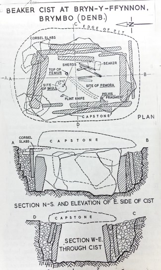 In 1958 a stone-line cist called Bryn y Ffynnon, was found 10 miles to the northwest of Wrexham at Brymbo, containing the well-preserved remains of a partial skeleton, a flint tool and a ceramic vessel known as a Beaker. The name means Hill of the Well or Spring (with many thanks to Reginald Iain de Crawford-Griffin for the translation). It seems to have been named for a small farm of the same name on Brymbo Hill. The site was excavated in 1958, and the results published in an excavation report in 1959. The man to whom the skeleton belonged, now nick-named Brymbo Man, was around 35 years old when he died some 3600 years ago. The burial, including the skeletal remains, is now on display in the Wrexham County Borough Museum, together with a reconstruction of the skeleton’s face. The site is discussed further below, and in detail in part 2.