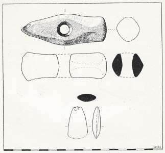 So far all the archaeological focus has been on the outcrops of the ridge, but that too is something of a sampling problem. Because of the considerable agricultural value of the land across the Cheshire plain, it is unlikely that many upstanding sites are left to be found, and any settlement sites are likely to have been ploughed in. Aerial photography has proved to be of marginal value due to the water retentive properties of the glacial soil, which prevents it drying out sufficiently to show variations in the soil during dry weather. However, there are hints that prehistoric archaeology may yet be found. On the plain not far from Beeston, the so-called “Beeston hoard” was found on the edge of a former freshwater spring, consisting of a Neolithic polished stone axe and an Early Bronze Age perforated stone axe-hammer. The remains of a round barrow surrounded by a ring of stones and a circular ditch were found at Morreys garden centre at Kelsall, containing the cremated bones of a child in an inverted collared urn. Unfortunately, discoveries like that have been few and far between.