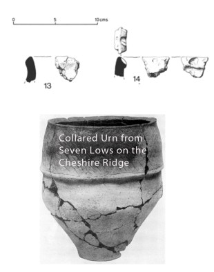 Collared urn sherds from Beeston (Royle and Woodward in Ellis 1993) and a photograph of collared urn from Seven Lows (source: Megalithic Portal)