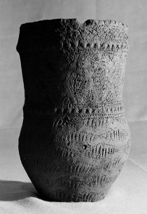 At Beeston, objects of both the earlier and mid Neolithic were placed by Ellis in his 1A phase. Objects diagnostic of the earlier Neolithic include leaf-shaped arrowheads (above), and carinated bowls (right) that used to be referred to as Grimston or Grimston-Lyles Hill ware, generally in circulation from c.3750BC. The carination here is the rim that circles the centre of the vessel, and in general refers to a vessel’s wall making a sharp change of direction. At Beeston both leaf-shaped arrowheads and sherds of carinated bowl are present, although the pottery is very fragmentary. Because clay was fired at relatively low temperatures, and because temper in the fabric was often organic or composed of stone pieces, the pots were relatively fragile and once abandoned, were vulnerable to frost and heat damage and to erosive forces. It is therefore comparatively rare to find Neolithic pottery found in tact. Although Grimston carinated wares continued to be used for hundreds of years in some areas, in most they were replaced by more regionally distinct styles.