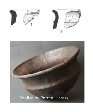 Grimston Ware sherds from Beeston (Royle and Woodward in Ellis 1993). The lovely replica showing what a complete carinated Grimston bowl would look like, is by Potted History